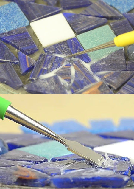 WITH COMFORT GRIP!  These are the essential tools for every mosaic studio from beginner to advanced. 4 different tools for scrapping, picking, removing, detailing your mosaics. Each has a comfort grip so it isn't abrasive to your fingers. WATCH how they work!